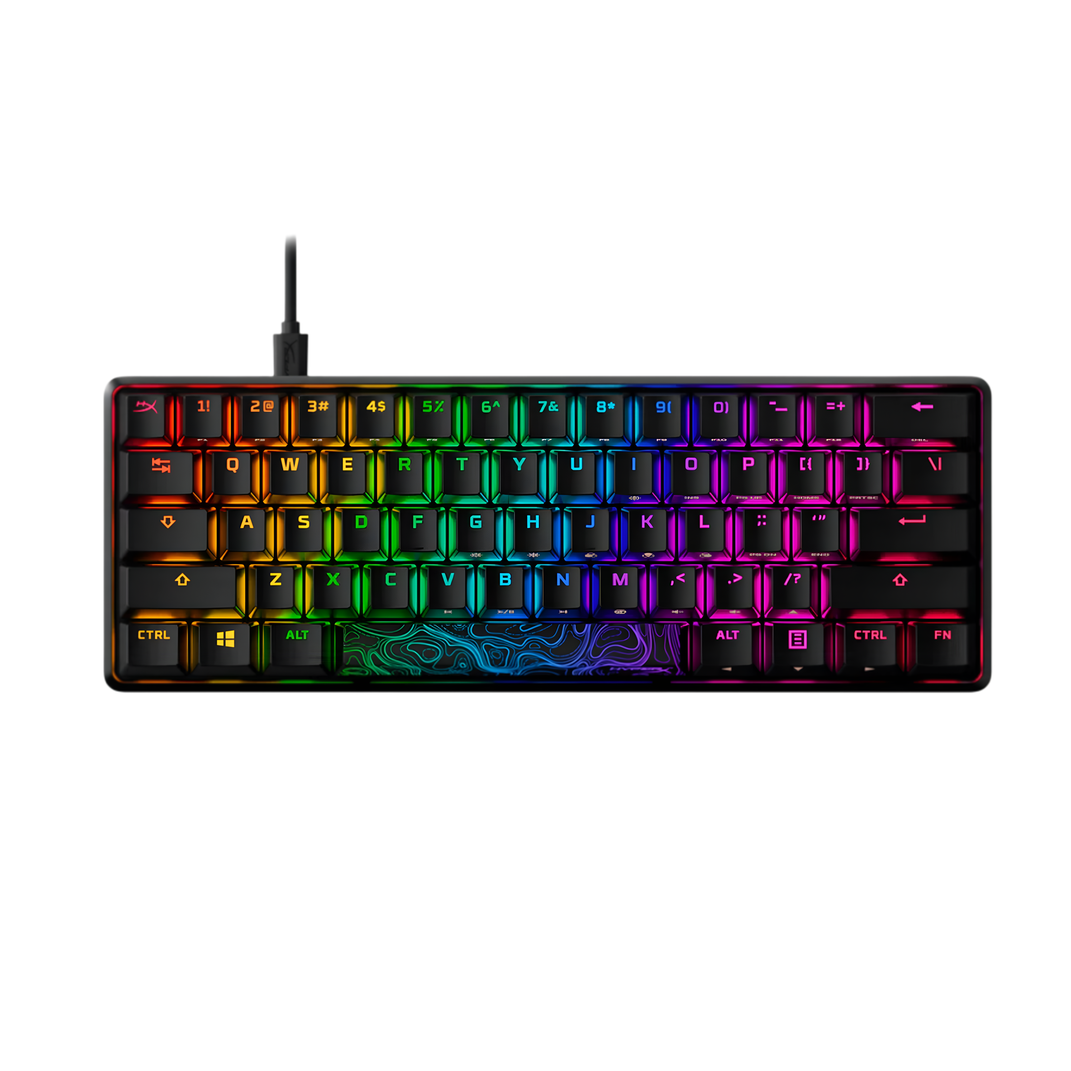 The HyperX Alloy Origins 60 is a compact mechanical gaming keyboard featuring tactile Aqua switches, per-key RGB lighting, an aluminum body, a detachable braided USB-C cable, and full anti-ghosting support for competitive gaming.